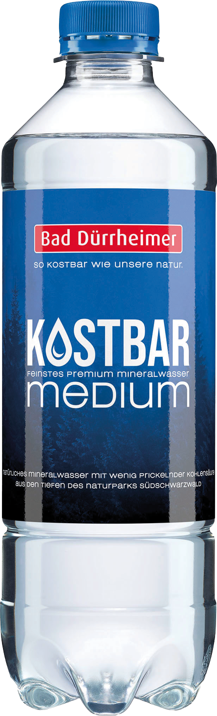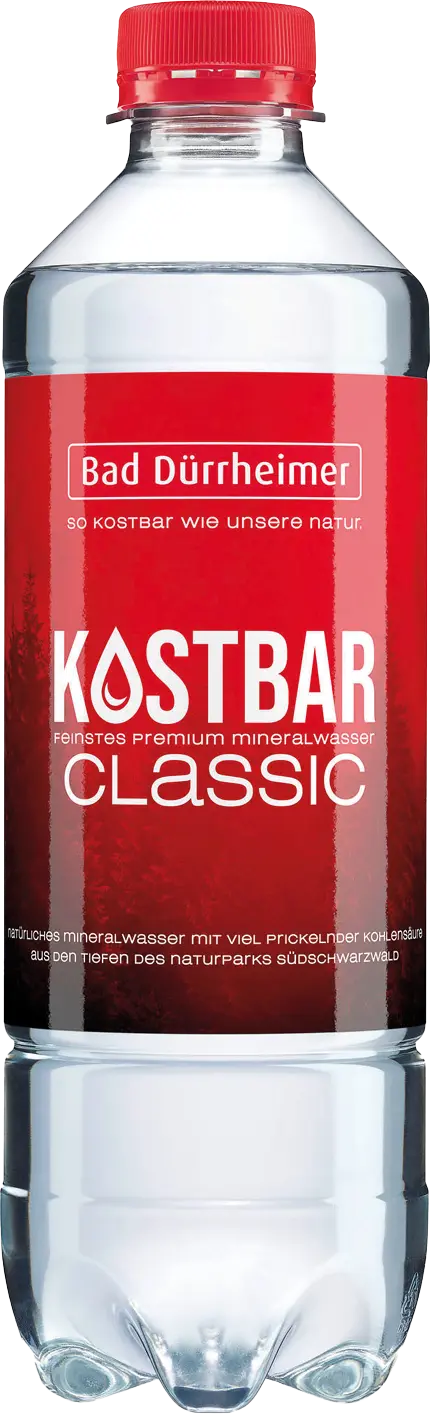 »Aufregend prickelndes, kostbares Bio-Mineralwasser von klarem, glänzenden Erscheinungsbild. Mineralisch im Geschmack, neutral im Abgang. Erfrischend und belebend zugleich. Ein Mineralwasser mit Charakter, das einen guten Schuss Kohlensäure verträgt – ja sogar fordert. Bad Dürrheimer kostbar ist das quellfrische Premium-Mineralwasser aus den geschützten Tiefen des Naturparks Südschwarzwald. Mit viel prickelnder Kohlensäure ein spritziger Genuss.«