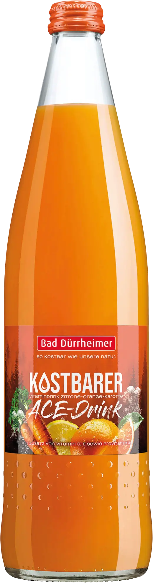 Zutaten: Natürliches Mineralwasser, Orangensaft aus Orangensaftkonzentrat (6 %), Apfelsaft aus Apfelsaftkonzentrat (6 %), Zitronensaft aus Zitronensaftkonzentrat (4 %), Zucker, Karottensaft aus Karottensaftkonzentrat (4 %), Säuerungsmittel Citronensäure, Vitamin C, Vitamin A, Vitamin E, Stabilisatoren Pektine und Johannisbrotkernmehl, natürliches Aroma, Konservierungsstoff Glykolipide.